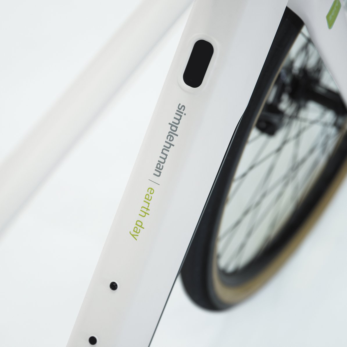 This visual proposal showcases the Simplehuman Limited Edition Earth Day eBike, which draws inspiration from nature with its color themes of iceberg, slate, sage, and canyon dust. The eBike features a matte white frame that beautifully accentuates the natural cork handles, saddle, and gum walls on the tires. The design incorporates a simple graphic messaging element, with the phrase "zero emissions," serving as a poignant reminder that biking is a cleaner and healthier alternative to driving, benefiting our planet.